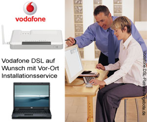 Vodafone Telefonanschlüsse mit DSL sind schon in vielen Anschlussbereichen möglich. Für die Vodafone DSL Tarife, Surf Sofort Tarife, Internet Flat und Telefon Flat fallen zur Zeit nur 9,95 € Einrichtungspreis an (statt sonst 99,95 €). Der günstige Einrichtungspreis gilt auch für einen Vodafone Neuanschluss (z.B. nach Umzug), einzige Vorraussetzung ist eine Teilnehmeranschlussleitung / TAE Dose in der Wohnung bzw. im Haus. Bei Bestellung im Aktionszeitraum bis zum 31.10.2010 erhalten Sie die meisten Tarife zum Aktionspreis (dauerhaft für die gesamte Vertraglaufzeit, nicht nur für die Mindestvertragslaufzeit wie bei anderen DSL Anbietern) sowie mit 50 € Startguthaben bei Onlinebestellung oder Hotline. Alle Vodafone DSL Tarife erhalten Sie auf Wunsch mit Installationsservice Vor-Ort, welcher die Installation der Vodafone Endgeräte (DSL Modem / Vodafone WLAN Router) im Umkreis von 150 cm zur vorhandenen TAE Dose sowie eine Einrichtung von DSL Modem / WLAN Router auf Ihrem PC bzw. Laptop beinhaltet. Call by Call und Preselection Tarife können an einem Vodafone Telefonanschluss (ähnlich wie bei anderen Anbietern) nicht genutzt werden. Die Mindestvertragslaufzeit für alle Vodafone DSL Zuhause Pakete beträgt 24 Monate. Der Vertrag verlängert sich automatisch um jeweils 12 Monate, wenn nicht vor Ablauf der Mindestlaufzeit gekündigt wird. Es gelten die Vodafone AGB. Alle Preisangaben auf dieser Informationsseite zu Vodafone DSL sind inkl. der dt. MwSt. |