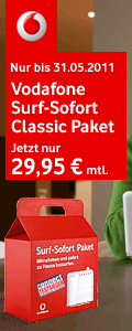 Vodafone Surf Sofort Paket UMTS - Telefon & Internet Flat Paket dauerhaft ab 19,95 €Sie brauchen keinen echten Festnetz Anschluss, sondern suchen einfach nur eine günstige Doppelflat zum Telefonieren und im Internet surfen? Dann ist das Vodafone Surf Sofort Paket UMTS die richtige Wahl für Sie. Dieses kostet regulär 29,95 € je Monat, aber bei Bestellung bis zum 30.06.20111 erhalten Sie diesen Vodafone Tarif dauerhaft zum günstigen Vorzugspreis von nur 19,95 € (10 Jahre Vodafone = dauerhaft monatlich 10 € sparen)! Bei diesem Vodafone Tarif haben Sie gar keinen Festnetz Anschluss mehr, sondern die Telefonie und der Vodafone Internetzugang werden über das leistungsstarke Vodafone Handynetz realisiert. Daher kann dieses besonders preiswerte Vodafone Doppelflat Tarif auch nur bestellt werden, wenn eine Vodafone UMTS Indoor Netzabdeckung verfügbar ist (hier Verfügbarkeit prüfen). Obwohl die im Vodafone Surf Sofort Paket UMTS aus der aktuellen Vodafone Fernsehwerbung enthaltene Telefonflat ins deutsche Festnetz über das Handynetz realisiert wird, erhalten sie dennoch eine Festnetz Telefonnummer aus Ihrem Ortsbereich bzw. können auf Wunsch Ihre alte Telefonnummer vom alten Telefonanbieter (z.B. Telekom) übernehmen. Lediglich einen Komfort Anschluss (2 Leitungen / 3-10 Rufnummern) können Sie für das Vodafone Surf Sofort UMTS Paket nicht erhalten, hier empfehlen wir Ihnen das nachfolgende Vodafone Maxi Paket. Die Internetverbindung beim Vodafone Surf Sofort Paket UMTS erfolgt per Vodafone UMTS / HSPA (HSDPA / HSUPA) Netz. Damit surfen Sie mit bis zu 7.200 kBit/s schnell zu Hause im Internet - also in etwas mit der Geschwindigkeit eines DSL 6000 Anschlusses. Lediglich bei einer Überschreitung des Datenvolumens von 5 GB je Monat (entspricht etwa 5.000 MB = ca. 10-15.000 Standard Internetseiten oder 100.000 Standard-E-Mails) wird die Geschwindigkeit im entsprechenden Monat auf 64 kBit/s (Modemgeschwindigkeit) beschränkt. Wenn Sie das Internet also intensiv nutzen möchten, empfehlen wir die Vodafone DSL Tarife, z.B. das oben beschriebene Vodafone DSL Classic Paket ab 24,95 € je Monat. Verfügbarkeit & Bestellung Vodafone Surf Sofort Paket UMTS |
